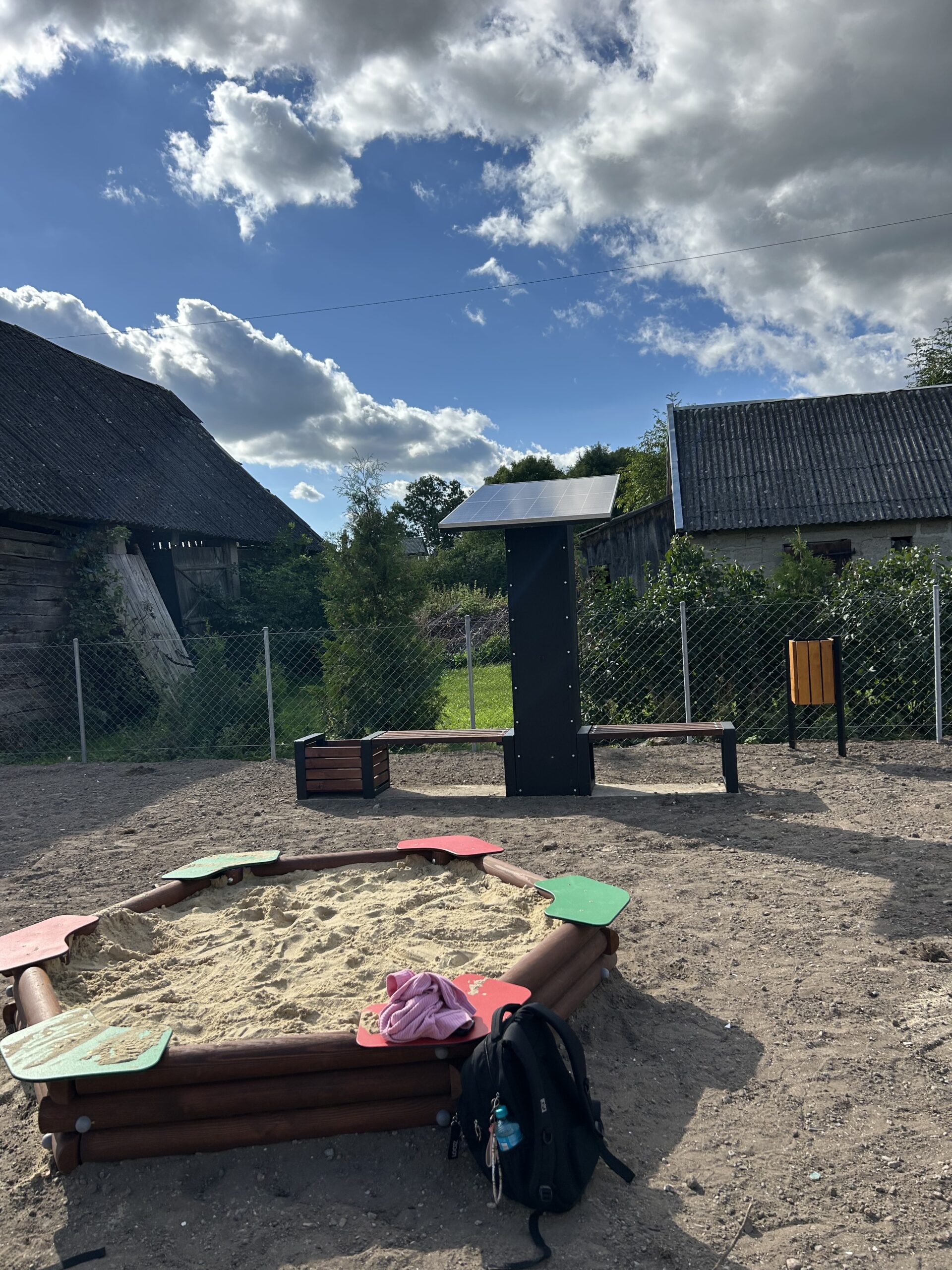 Zakres zadania obejmował przygotowanie oraz zagospodarowanie terenu, montaż nowego ogrodzenia wraz z dwuskrzydłową bramą i furtką, montaż fabrycznie nowych urządzeń zabawowych posiadających certyfikaty bezpieczeństwa na place zabaw tj. huśtawka podwójna metalowa z 2 siedziskami, karuzela tarczowa, bujak sprężynowiec, zestaw zabawowy, pomost z belką balansującą, piaskownica sześciokątna z bali 2,4m x 2,08m HDPE, huśtawka ważka na sprężynach, kosz na śmieci; montaż altany ogrodowej wraz ze stołem i ławkami, instalację innowacyjnej ławki solarnej wyposażonej w panel solarny do ładowania drobnych urządzeń, instalację tablicy informacyjnej.